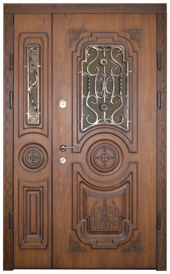 Парадные двери относятся к изделиям премиум-класса. Изготавливаются такие модели из металла толщиной не менее 2,0 мм, конструкция усиливается ребрами жесткости. Основной фактор, делающий парадные двери таковыми – их внешняя отделка. Для декора этих дверей, как правило, используют массив дуба, ясеня или сосны, натуральный шпон, корабельную фанеру, МДФ-панель, покрытую атмосфероустойчивой пленкой Винорит (VINORIT). Декоративные вставки из антивандального стекла, с применением элементов ковки, рисунок, который будет сочетаться с рисунком решеток на окнах, придаст коттеджу неповторимый внешний вид. Можно декорировать дверь витражным узором – и ваш дом заиграет яркими красками. По конструкции парадные двери могут быть как одностворчатыми, так и двустворчатым. При достаточной высоте проема, можно изготовить входную группу с декоративной вставкой сверху – прямоугольную или в виде арки. Терморазрыв в конструкции парадной двери сохранит тепло в доме, и предотвратит промерзание и кондедсирование двери в холодное время года, при этом не требуется обустройство в доме холодного тамбура.