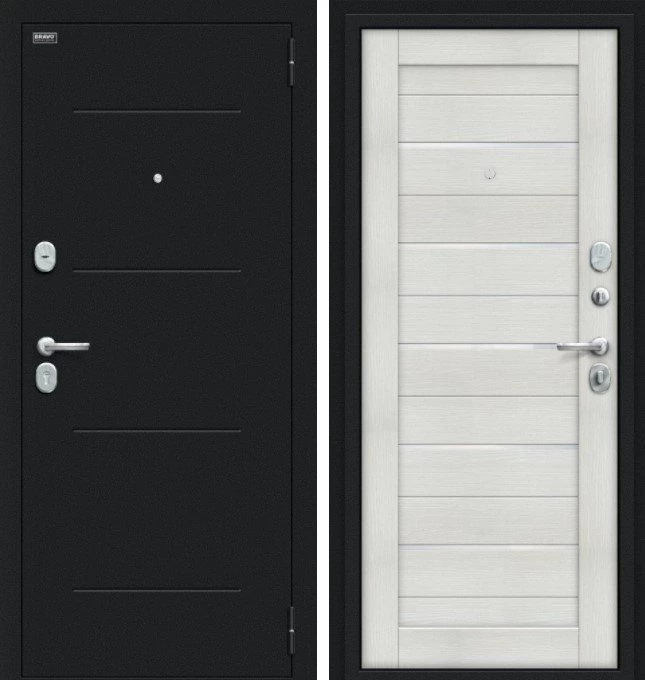 Надежная входная Браво Техно Kale Букле черное/Bianco Veralinga премиум класса по цене 33 829 руб. Большая толщина стали защитит от проникновения в ваш дом, квартиру или коттедж. Используется очень качественная фурнитура: замки, цилиндры, ручки, защелки. Покрытие и отделка двери изготовлено под внимательным контролем производителя. Дверь имеет долгий срок службы и гарантию.