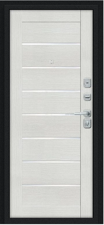 Надежная входная Дверь Браво Техно/BChrome Букле черное/Bianco Melinga премиум класса по цене 32 679 руб. Большая толщина стали защитит от проникновения в ваш дом, квартиру или коттедж. Используется очень качественная фурнитура: замки, цилиндры, ручки, защелки. Покрытие и отделка двери изготовлено под внимательным контролем производителя. Дверь имеет долгий срок службы и гарантию.