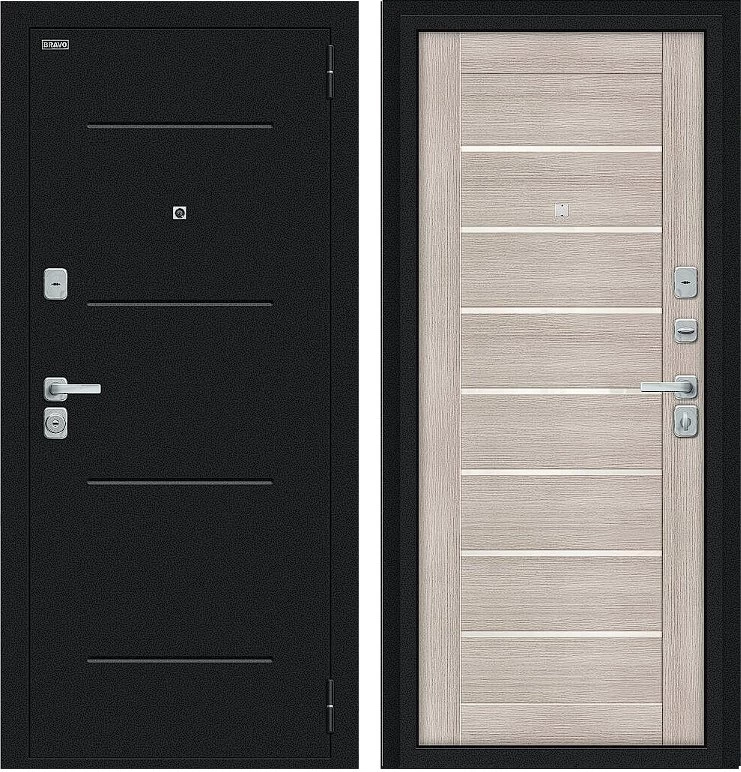 Надежная входная Дверь Браво Техно/BChrome Букле черное/Cappuccino Melinga премиум класса по цене 32 679 руб. Большая толщина стали защитит от проникновения в ваш дом, квартиру или коттедж. Используется очень качественная фурнитура: замки, цилиндры, ручки, защелки. Покрытие и отделка двери изготовлено под внимательным контролем производителя. Дверь имеет долгий срок службы и гарантию.